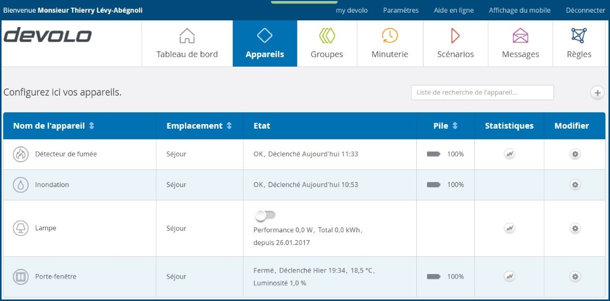Une fois cette connexion physique effectuée, il faut créer un compte sur le site de Devolo. Car toutes les opérations de pilotage des différents interrupteurs et autres détecteurs sont prises en charge par un service cloud hébergé par le constructeur. Une solution classique, qui permet ensuite de gérer la solution à distance, sans contraintes géographiques, à partir de n’importe quel PC, tablette ou smartphone, simplement en s’identifiant.